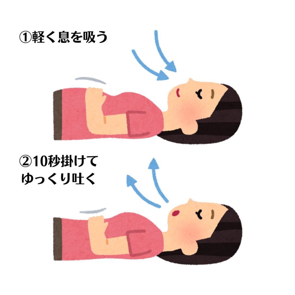 寝ながら鼻で息を軽く吸ってから、自分の耳で聞こえるくらいの大袈裟なイメージで10秒掛けてゆっくり吐き続けるだけです。